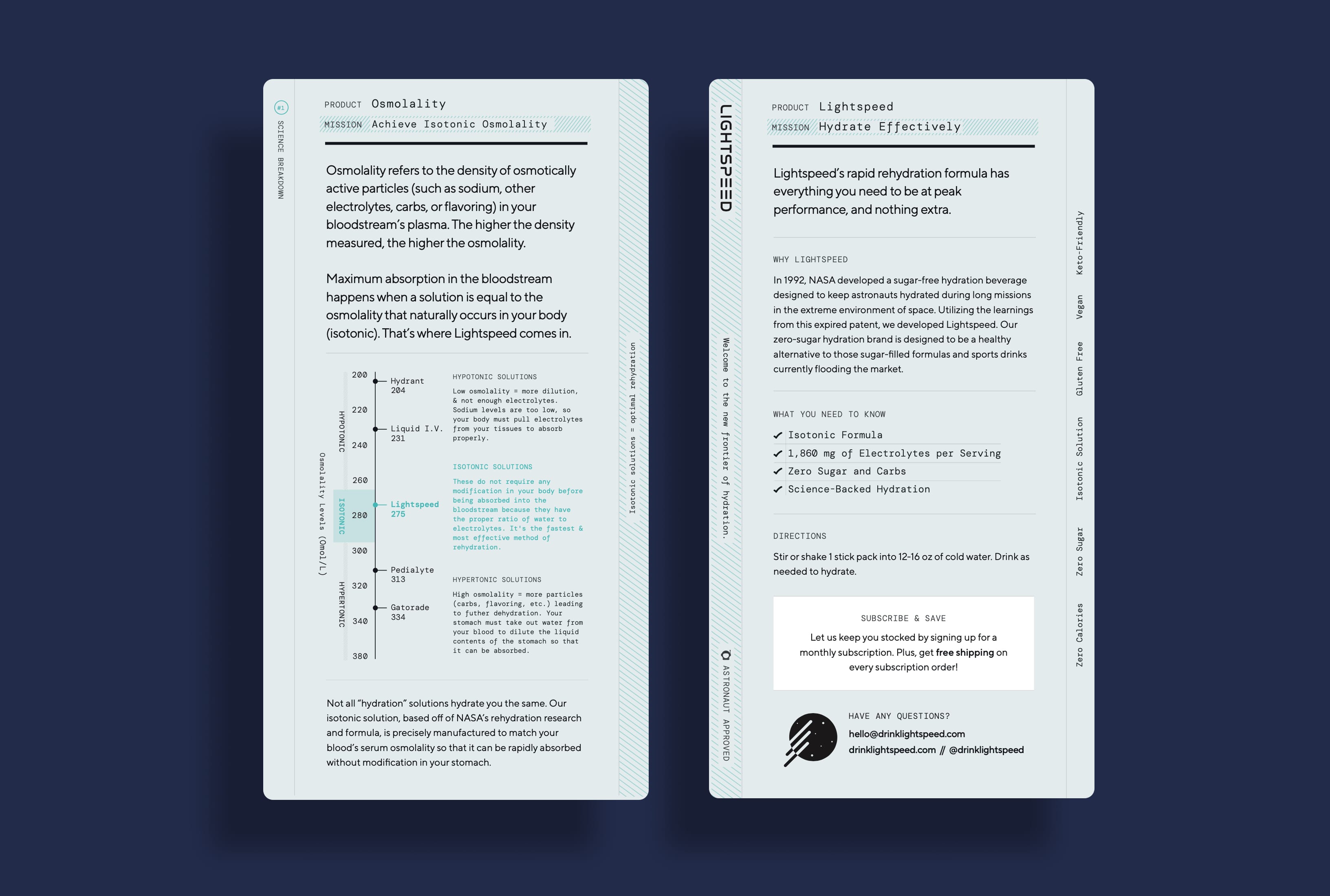 Due to the competitive nature of the hydration space (pun intended), education was a pillar of this brand. Through researching the science, developing the visualizations, and simplifying complex topics, Lightspeed explored a unique perspective in an otherwise saturated market.